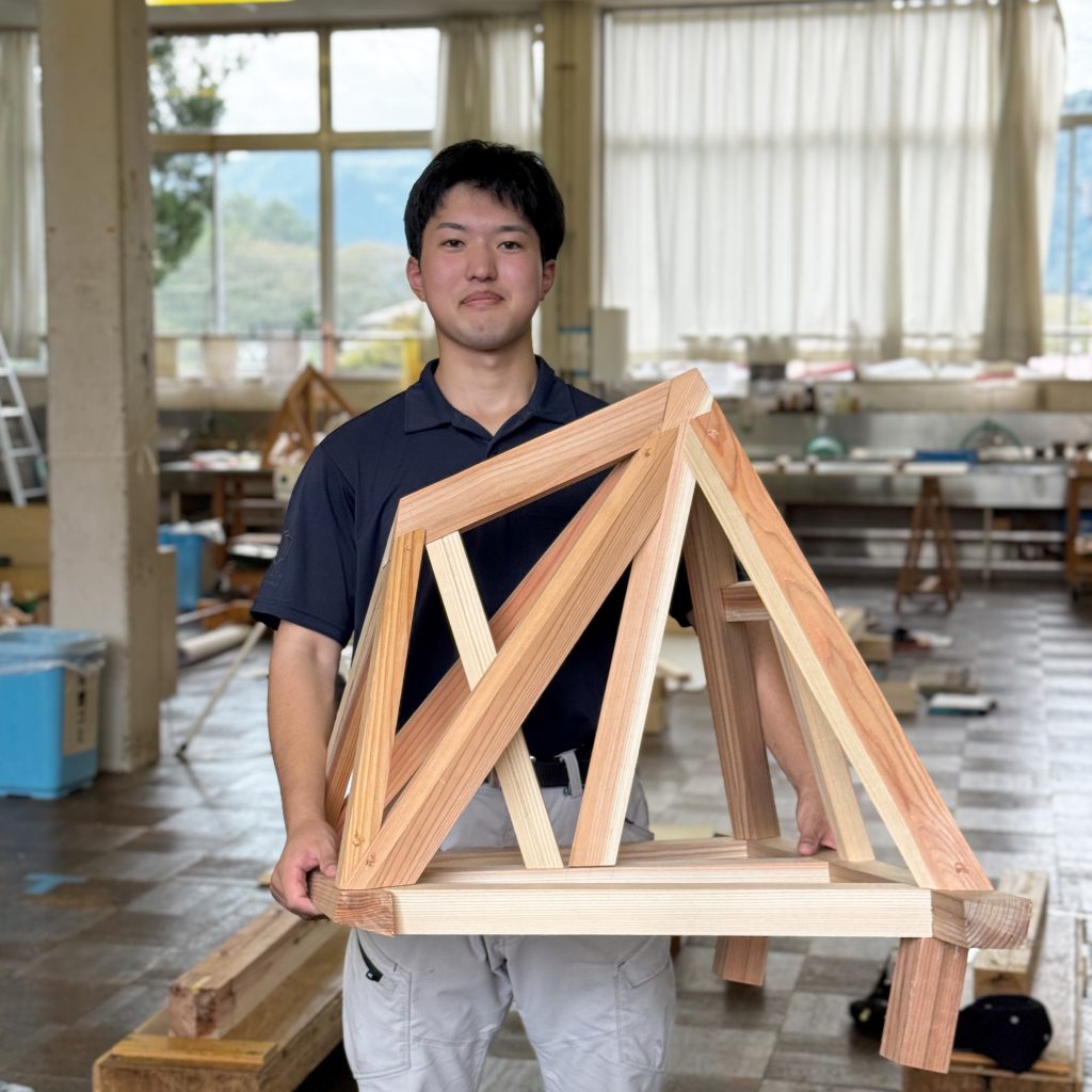 今大会「建築大工」職種では、課題図に示された複雑な形状の木造小屋組の一部を製作します。現寸図の作成、木削り、墨付け、仕口加工、組立までを標準12時間で仕上げる高難度の内容で、正確さや仕上がりの美しさが総合的に評価されます。