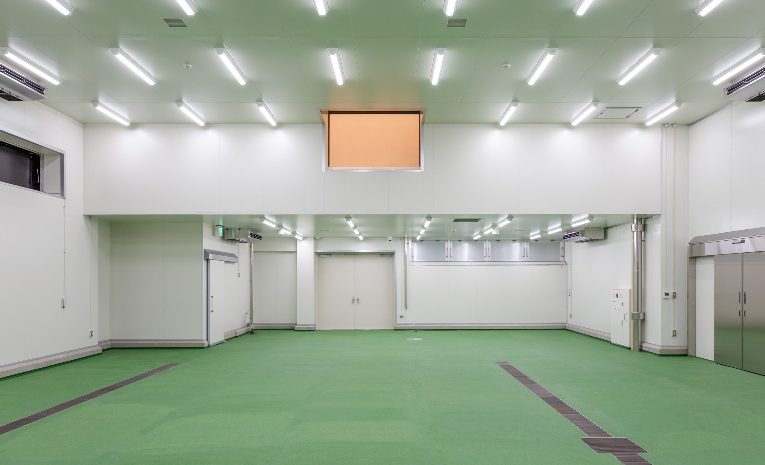 ハムカツ・ハムステーキを製造を行う工場です。高さが5mを超える大型の生産機械を設置しているため、部屋ごとに天井までの高さが異なっています。各階のフロアレベルを綿密に計算し、各工程の様子が2階から見学できるような通路を設けています。