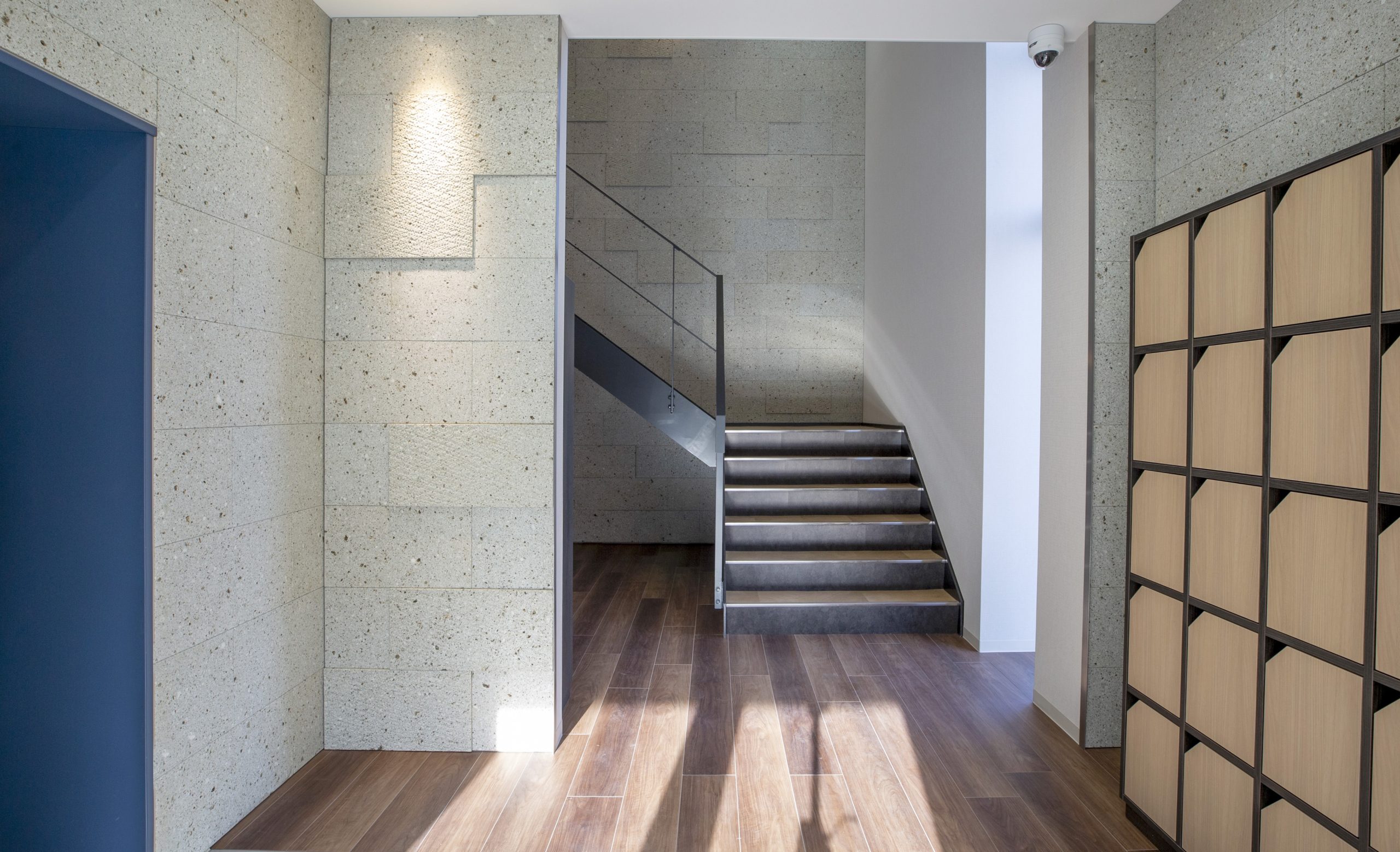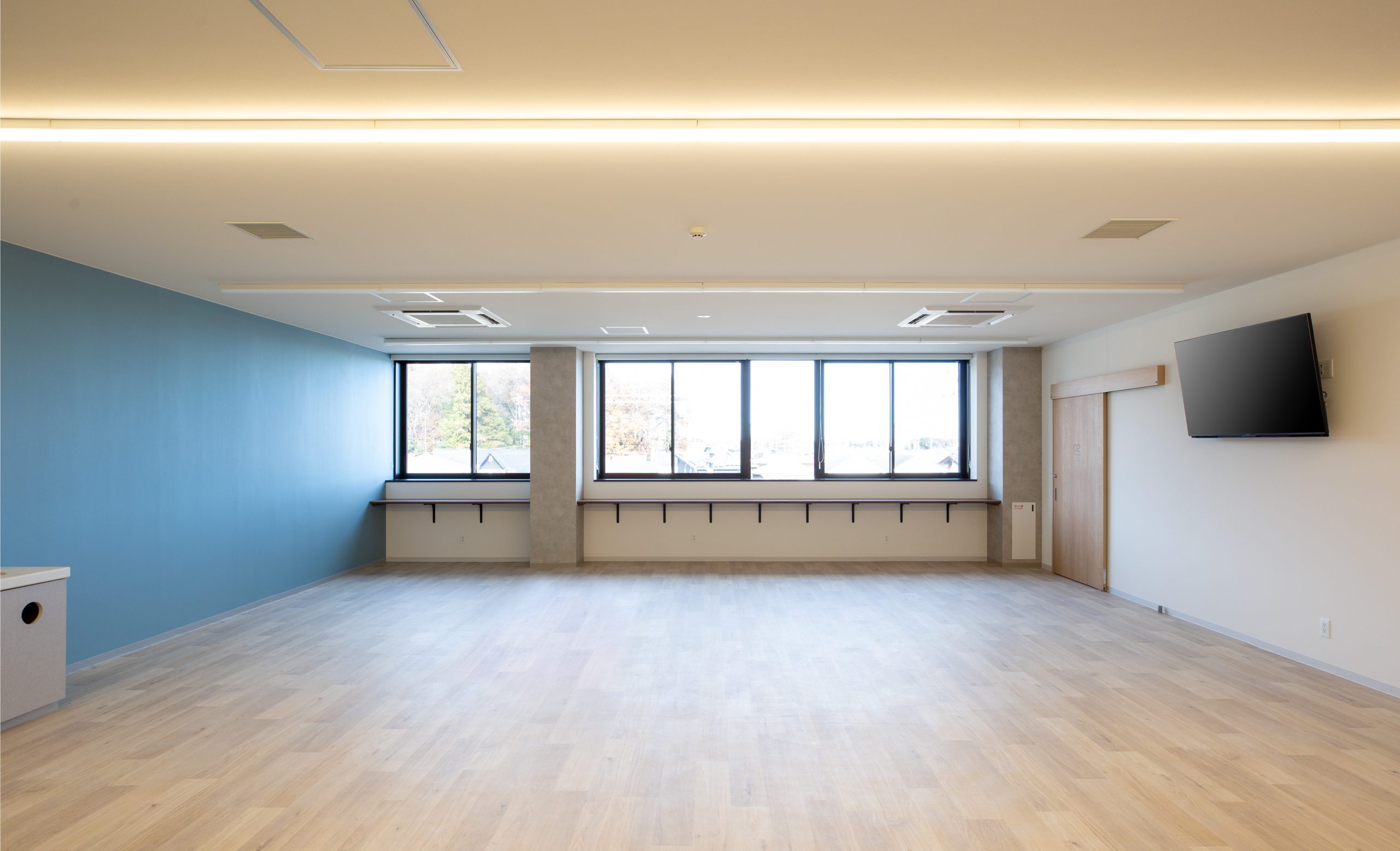 外壁は数種類の素材を使い分けることで、見た目のメリハリを付けました。エントランスの壁面には宇都宮市の特産物である大谷石を使用し、高級感のある仕上がりです。エントランスは吹き抜けになっており、気持ちよくお客様をお迎えできる玄関となっています。休憩室にはカウンター席を設け、落ち着いて休憩できる環境を整えました。