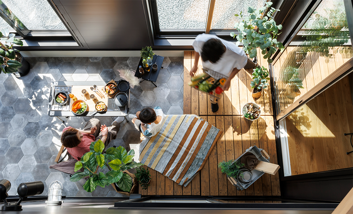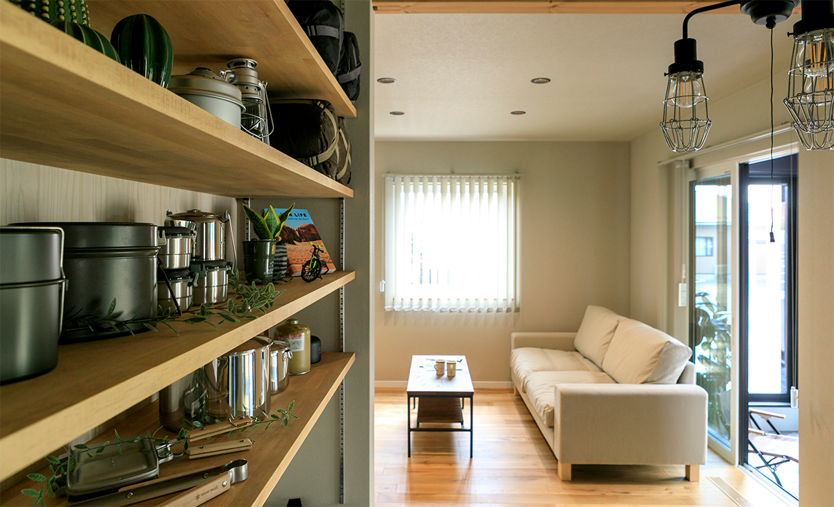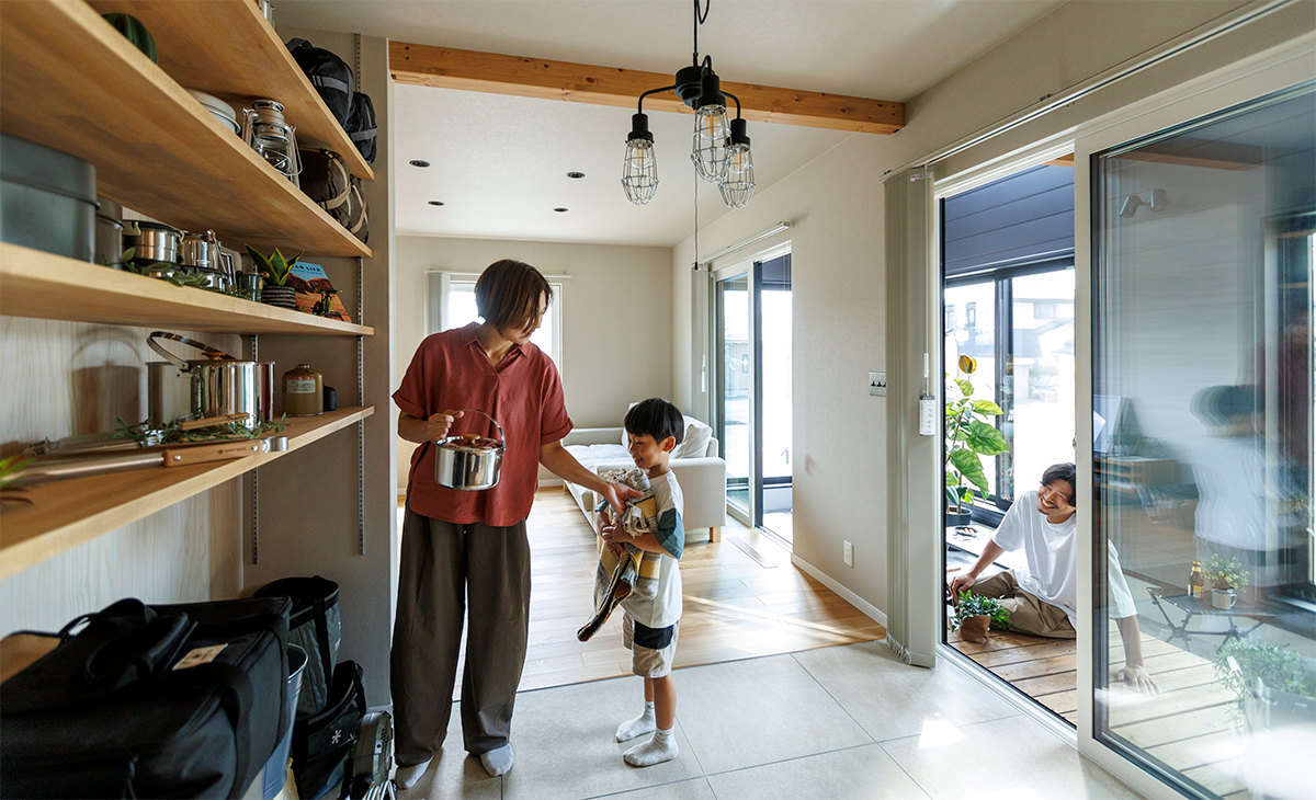 家の中でも存分に遊べるお家。インナーテラスはリビングやキッチン、2階とつながり、どこにいても家族の気配が緩やかに感じられます。土間スペースを1階の中心に設置し、床のキズを気にせずアウトドアグッズの手入れができるのも日常的に遊ぶポイントのひとつです。