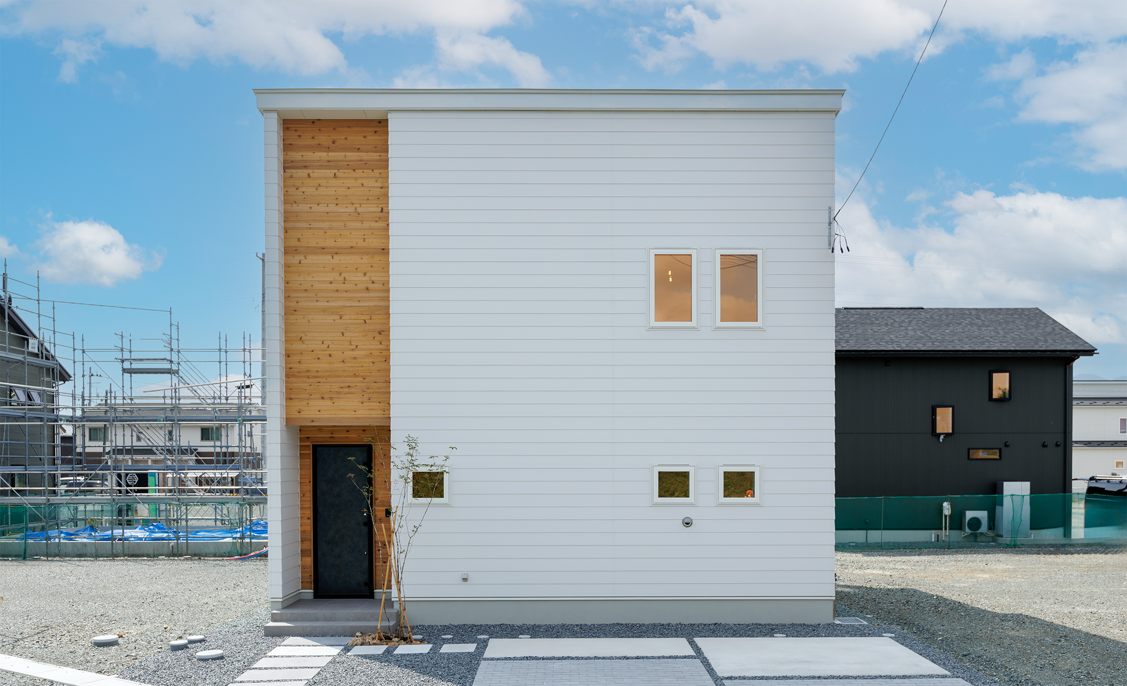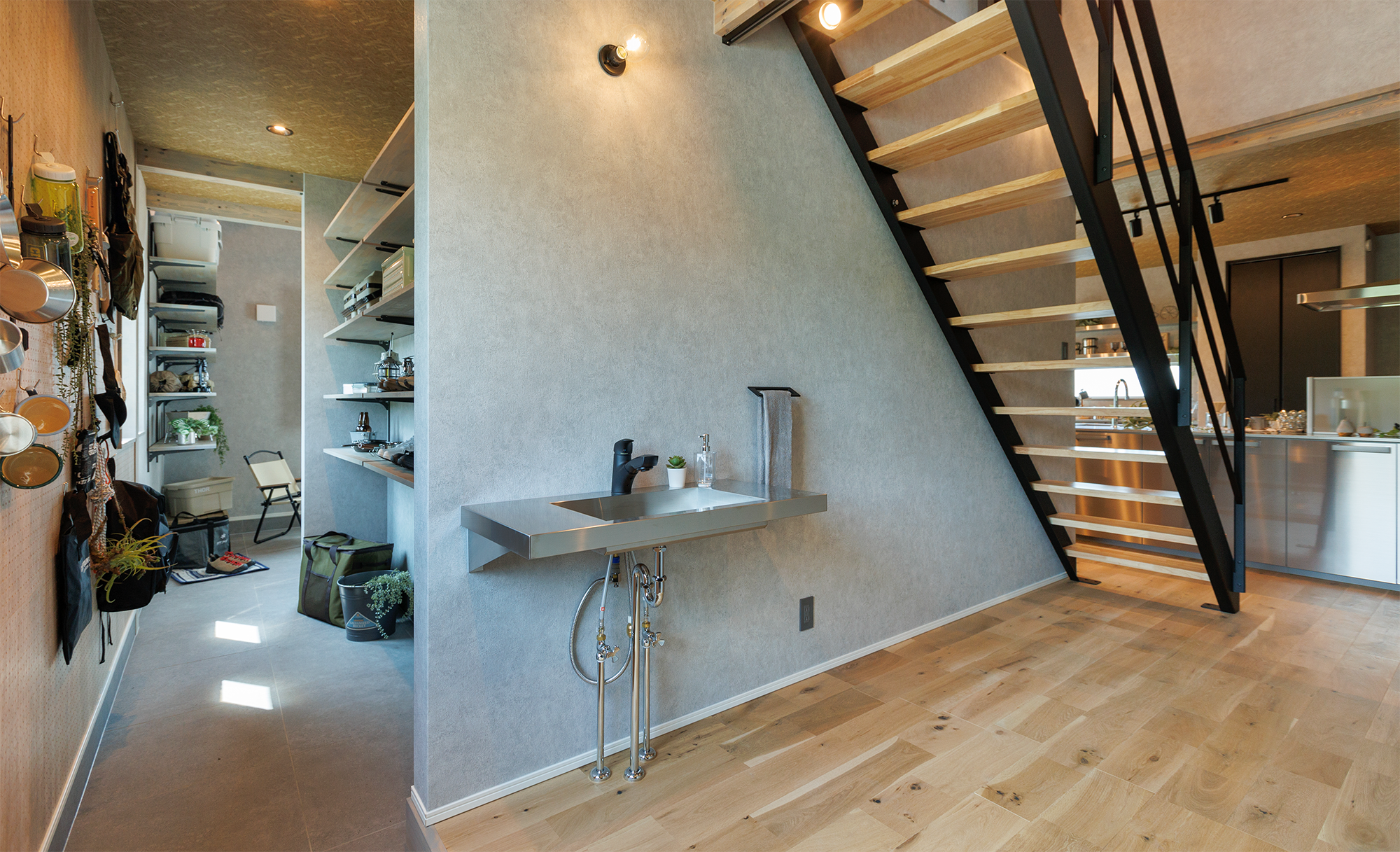 街の中でも一際目を惹く、都会的な印象の外観デザイン。ソトとのつながりを意識し、リビング、土間スペース、ウッドデッキがつながる間取りです。アウトドアグッズを飾って収納でき、リビングから眺めることもできます。