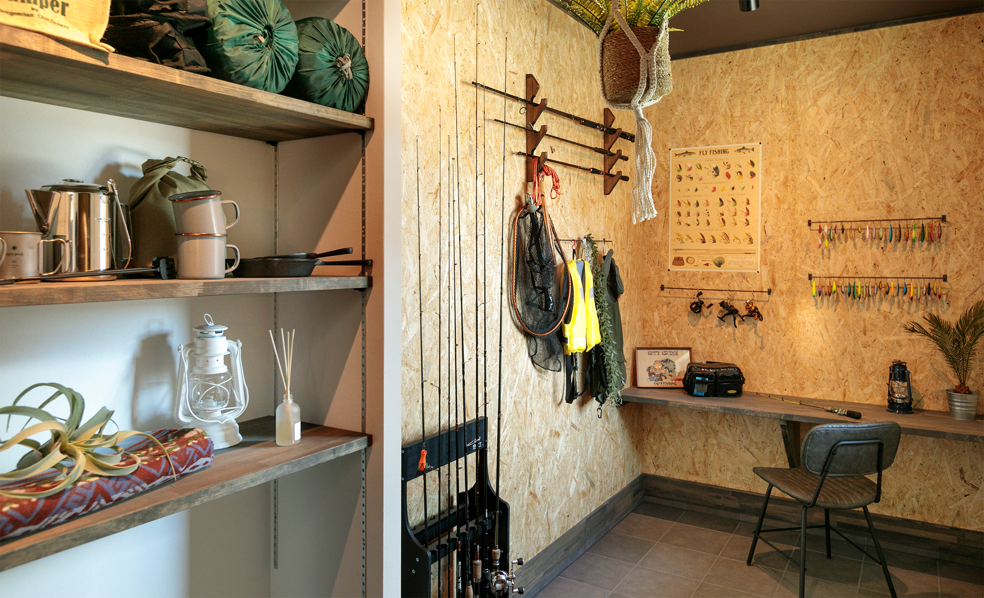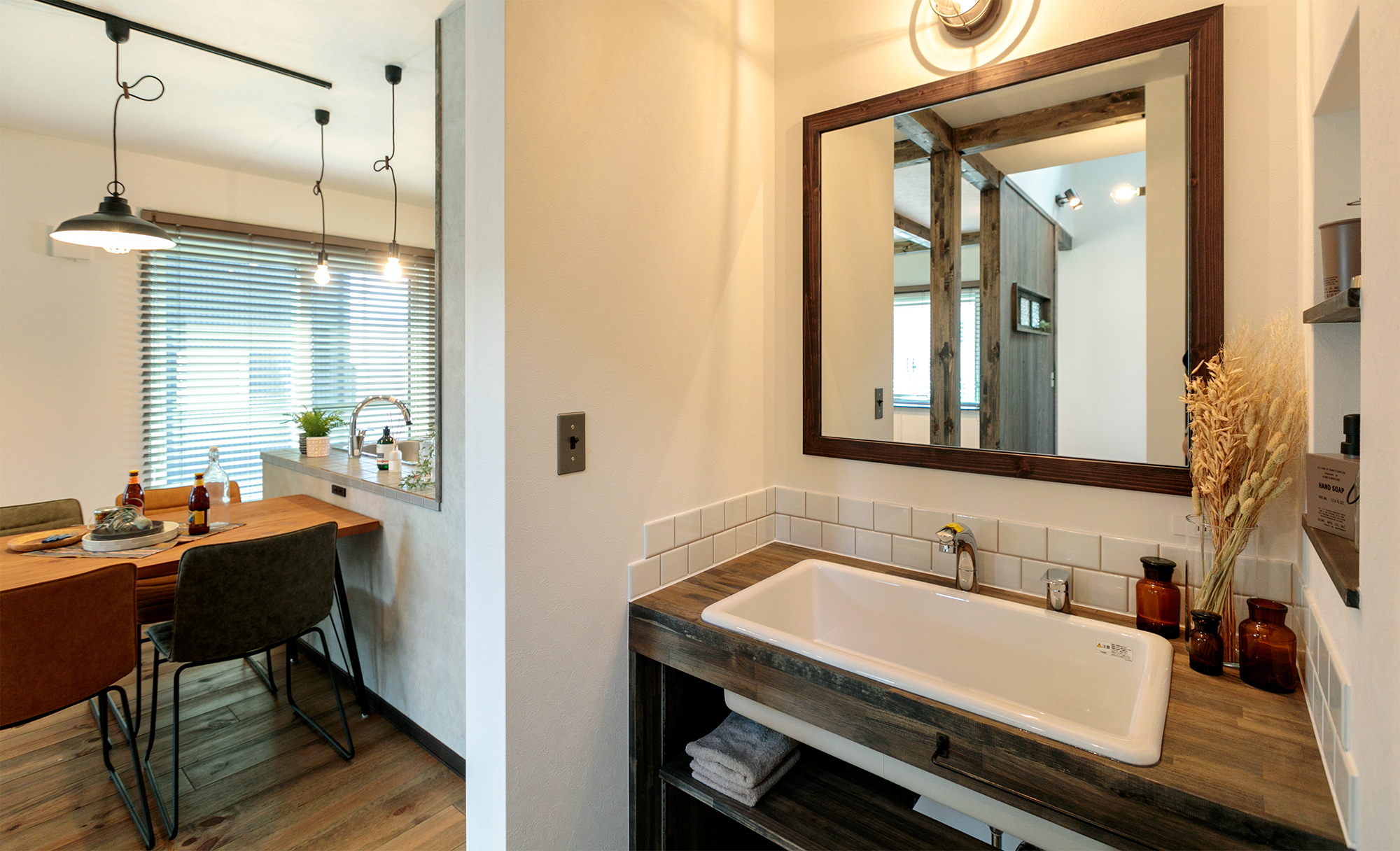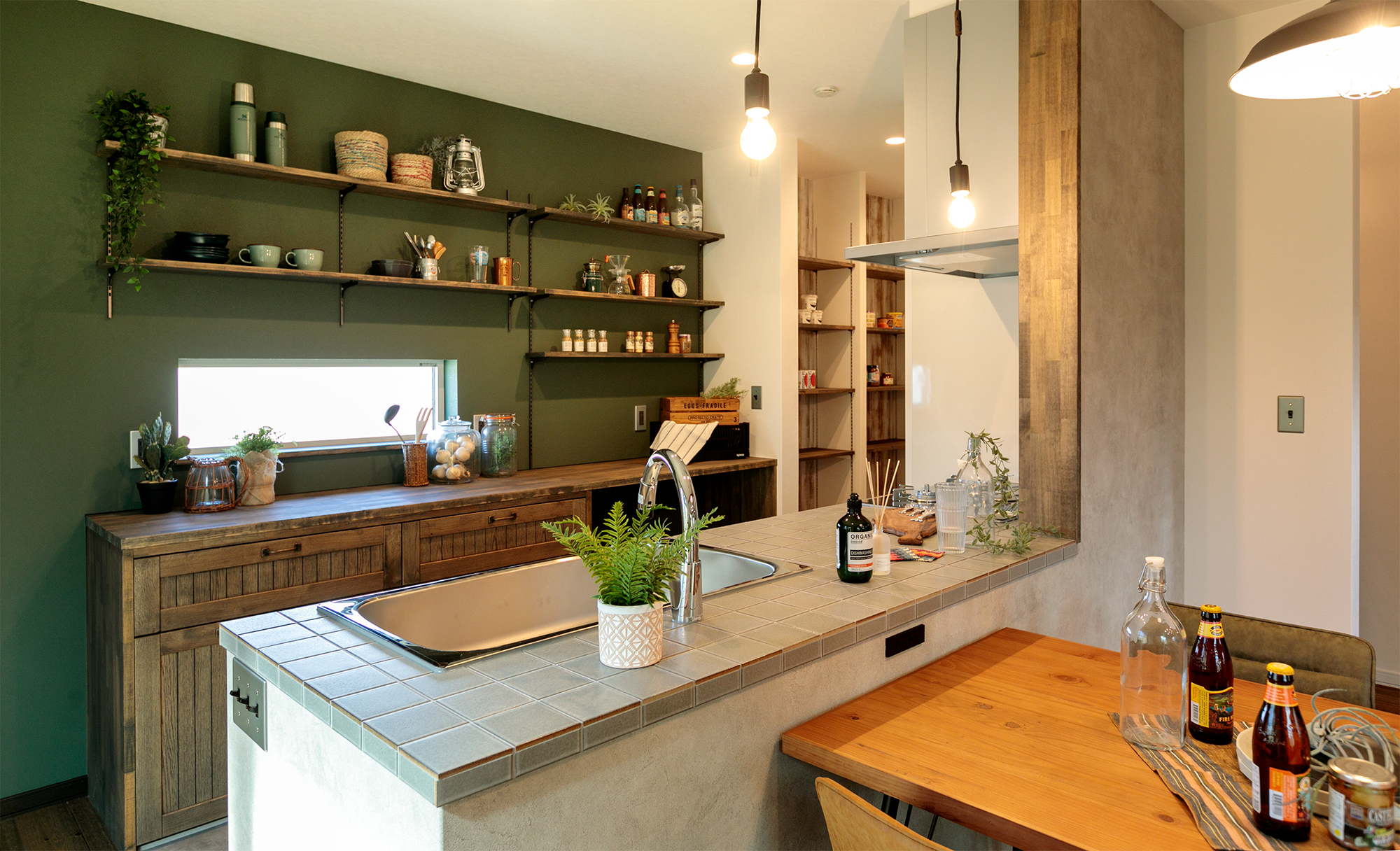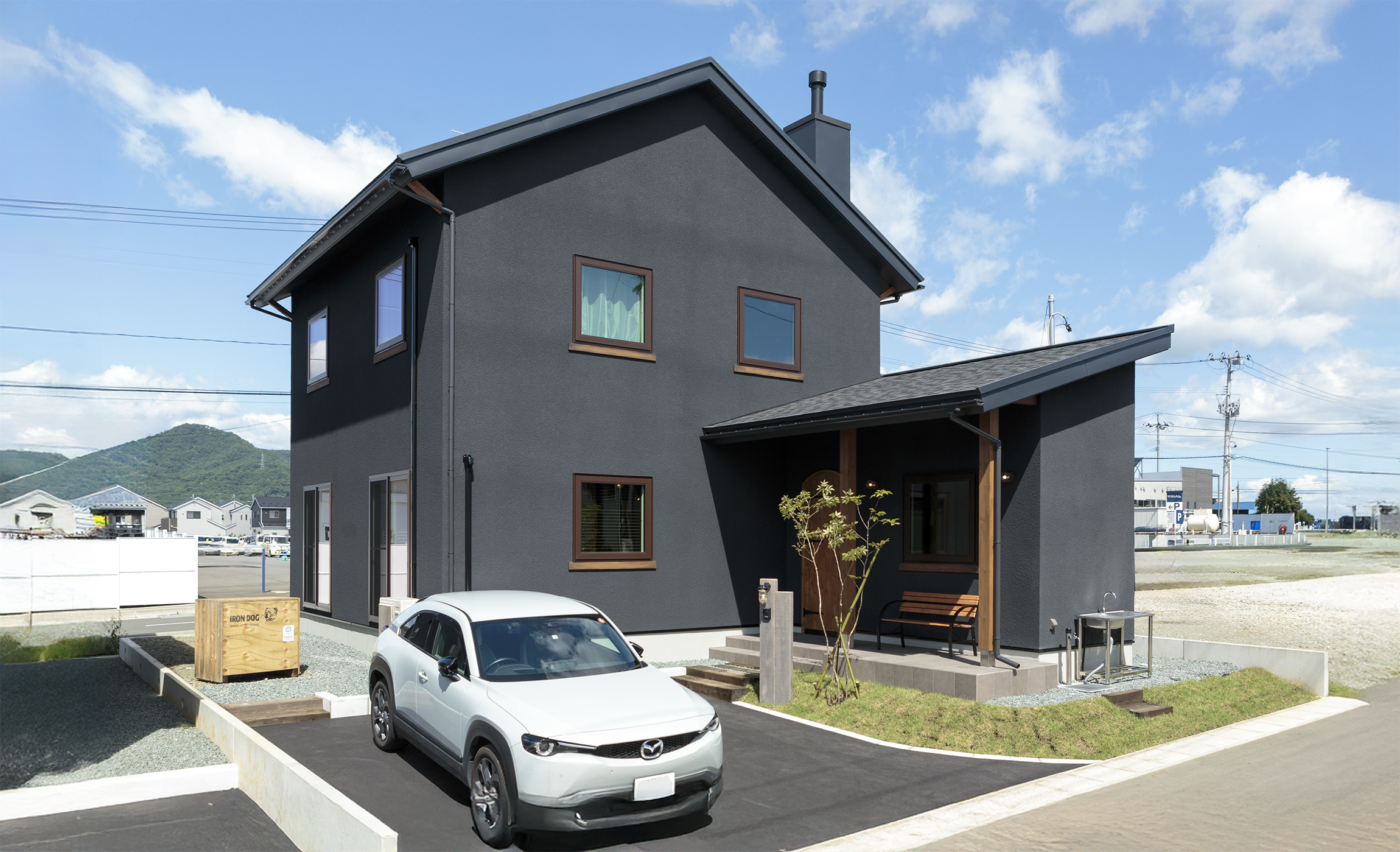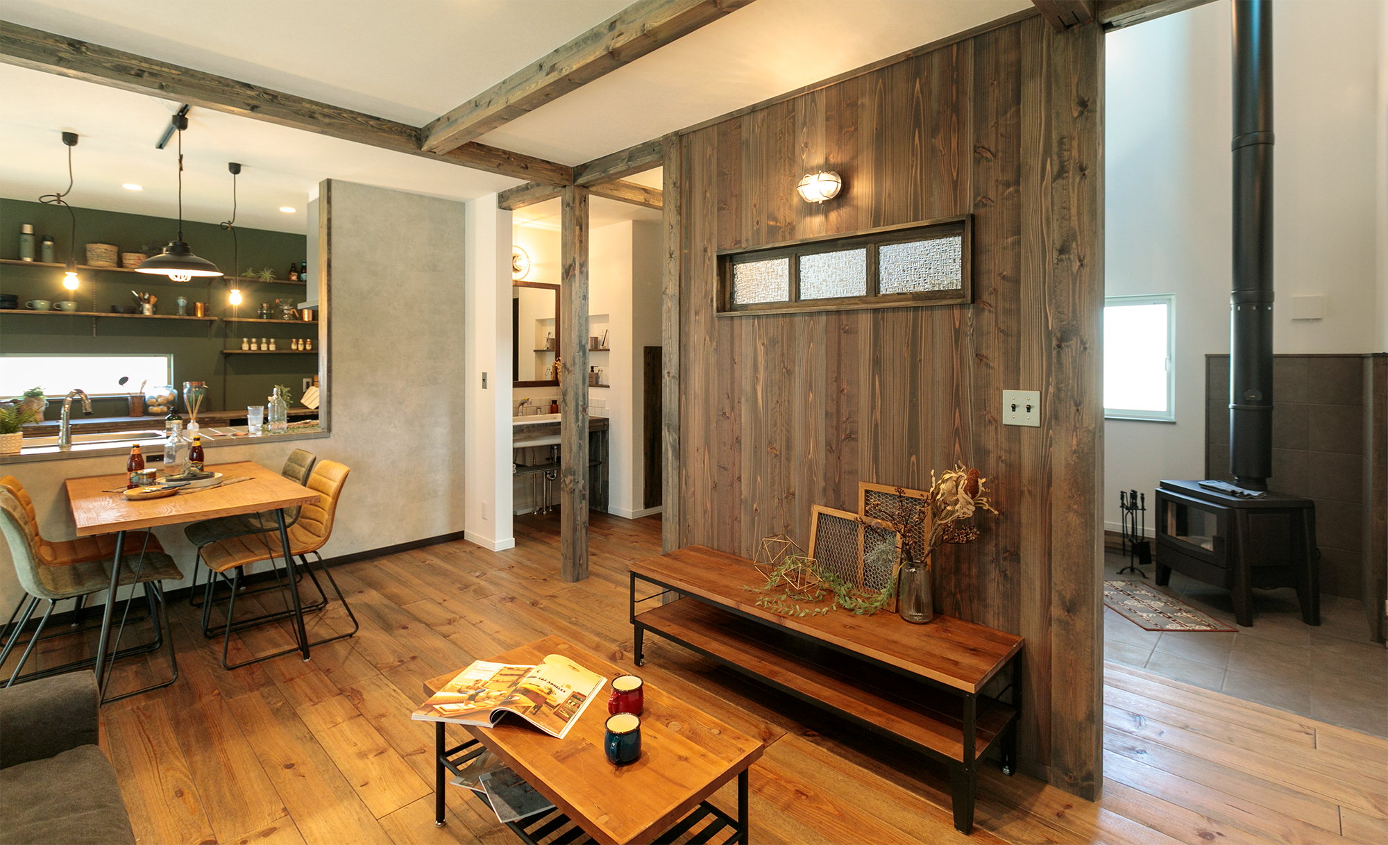 シックな佇まいが魅力的なお家。玄関からすぐの広い土間スペースと薪ストーブはまるで、山小屋暮らしのよう。薪ストーブスペースは吹き抜けになっており、見せ梁がアクセントになっています。リビングに設置した羽目板も空間に木のぬくもりをプラスします。